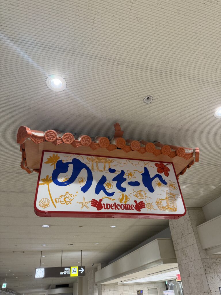 那覇空港に到着。到着口の天井からぶら下がる赤瓦のウェルカムボードが、旅のスイッチを押してくる。**「めんそーれ」**の文字、かわいくて思わず見上げちゃうんだよね。🌺