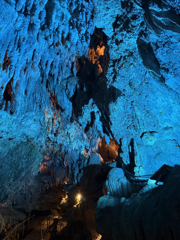 青いライトが鍾乳石を照らすと、壁一面が海底のように発光して見える。時間の層が重なってできた地形の中に小さく立っていると、