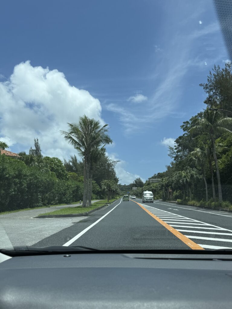 正義。好きなタイミングで寄り道できるし、海の色が変わるたびに車を止められる。今日は北谷・読谷方面へ、国道58号を北上予定。