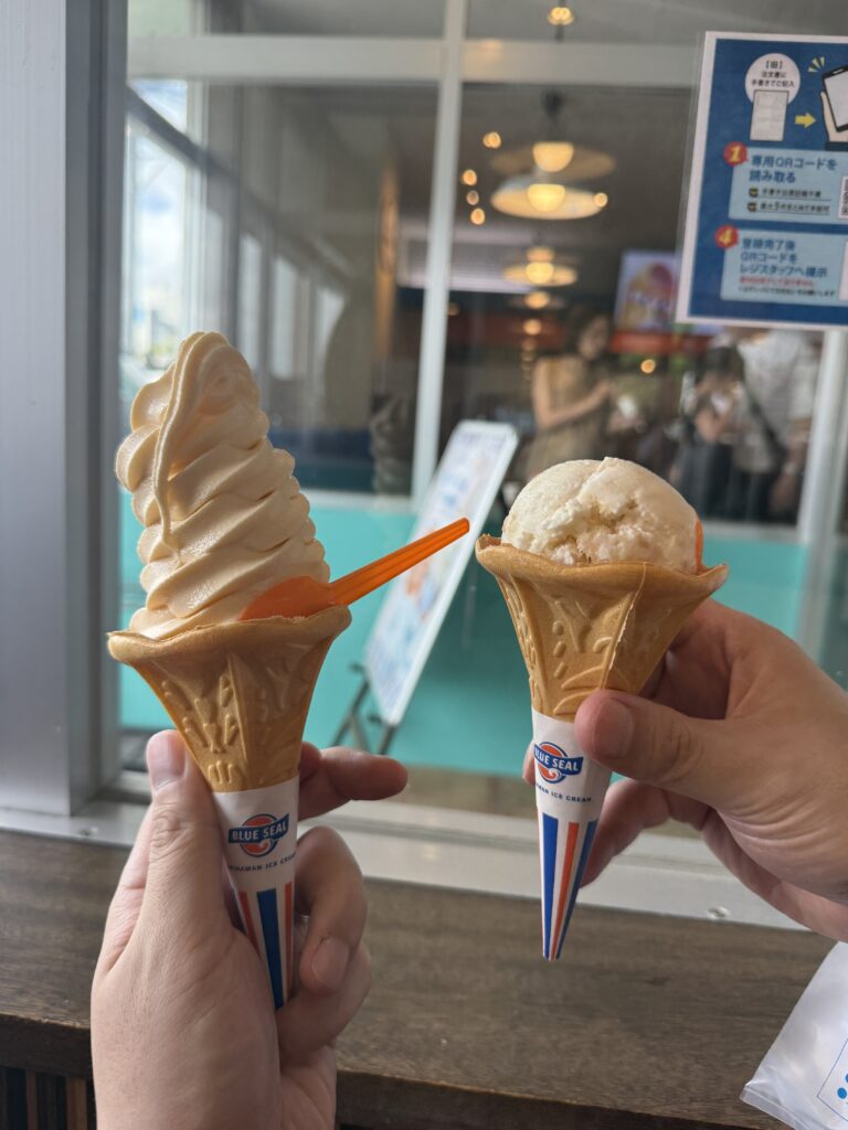 沖縄の朝は、アイスで開きたい日がある。「BLUE SEAL」のストライプのファサードを見た瞬間、足取りが早くなる。選んだのは、柑橘が香るシークヮーサー系のさっぱりソフトと、沖縄の定番塩ちんすこうのスクープ。甘さと塩味のゆらぎが楽しくて、気づけばペロリ。🍦