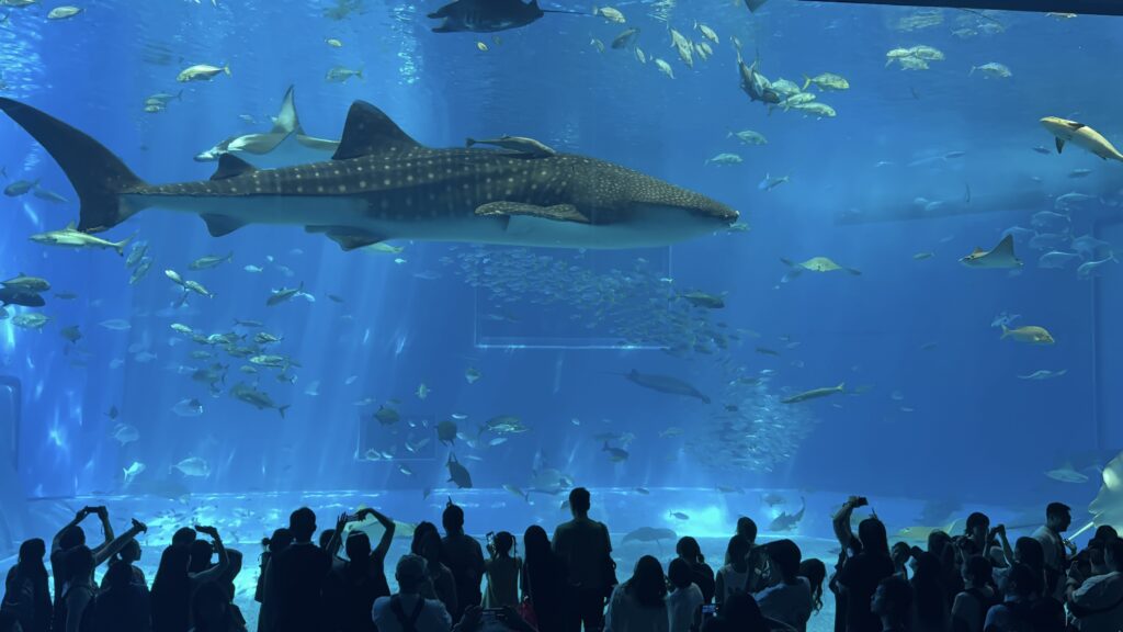ドライブは海沿いへ。日差しが強くても、窓の向こうの海が透明で、つい黙っちゃう。「沖縄美ら海水族館」についたら、まずは大水槽“黒潮の海”へ直行。
