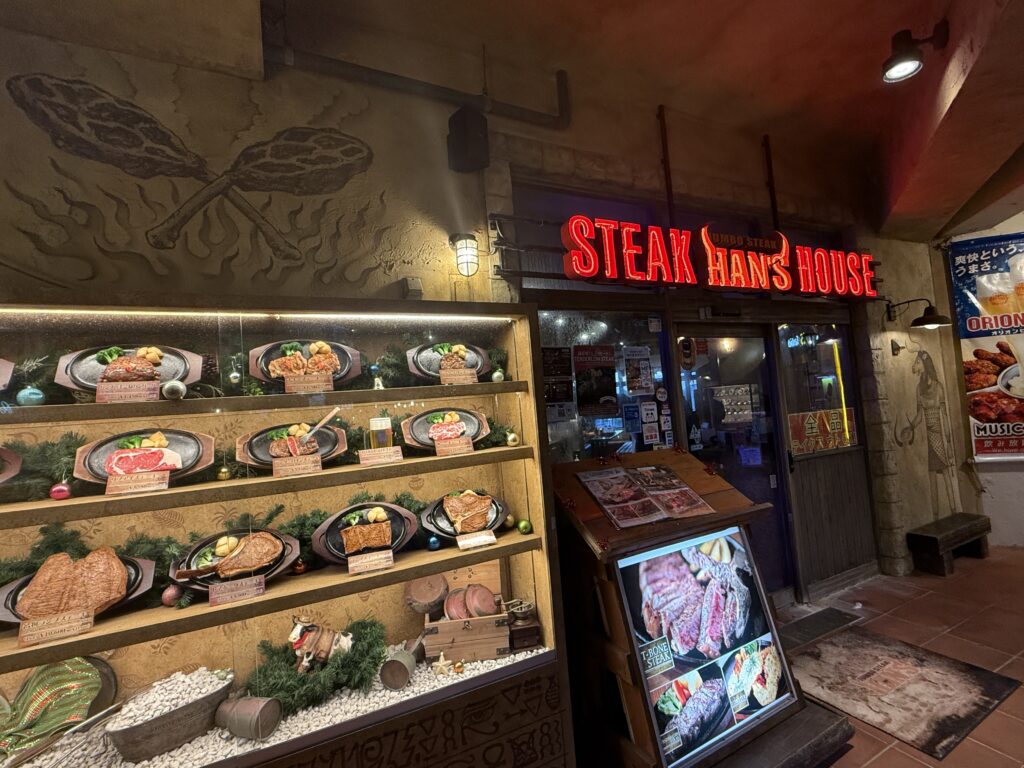 夕暮れは美浜アメリカンビレッジへ。ヤシの影、ネオン、波の音。散歩しているだけで映画のワンシーンみたい。ディナーは赤いネオンが誘う**「STEAK HAN’S HOUSE」**へ。
